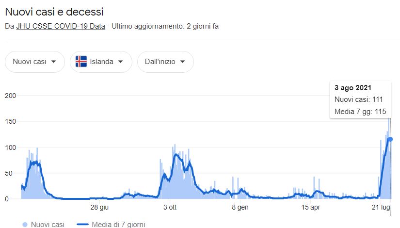 Il numero dei casi in terra islandese è incrementato rapidamente (si guardi il grafico pubblicato di seguito, con la curva dei contagi superiore anche alle precedenti ondate) e le autorità locali hanno dovuto prendere conseguentemente una serie di nuove misure – nonostante la campagna vaccinale abbia raggiunto picchi del 100% in alcune fasce d’età (per esempio nelle persone con più di 50 anni).